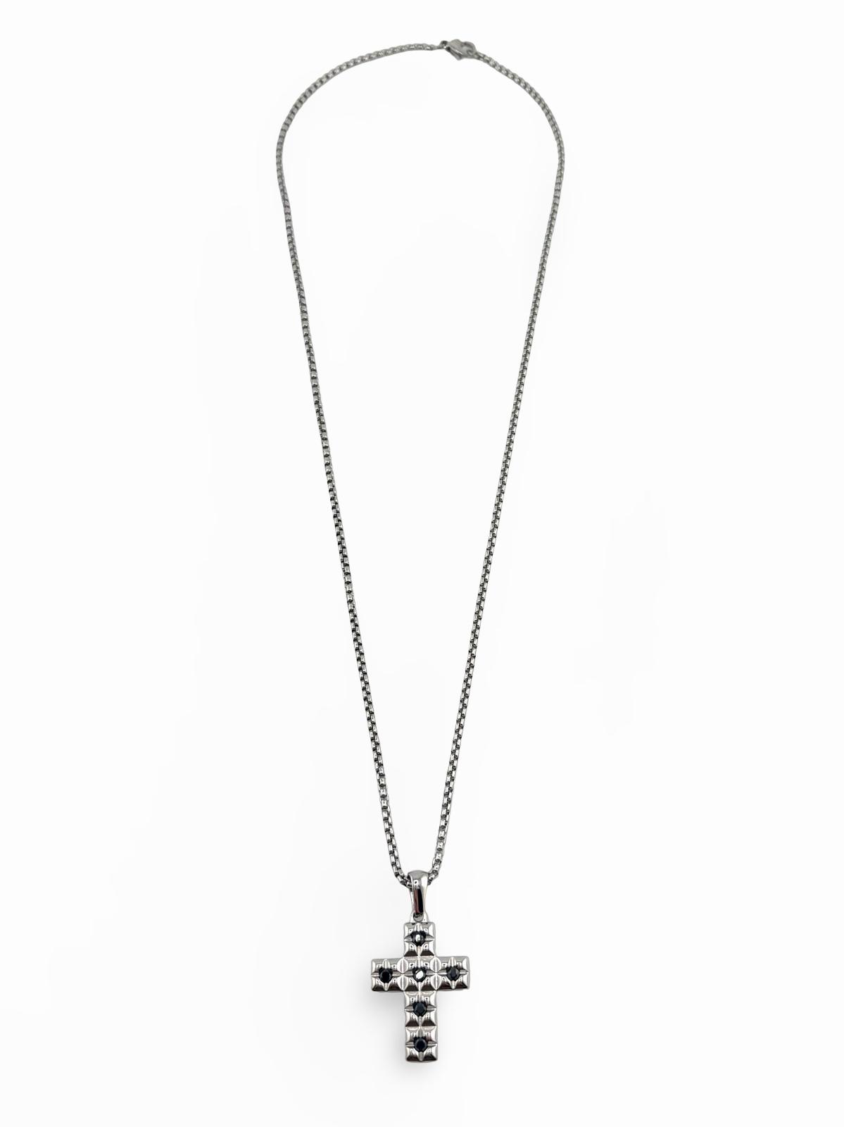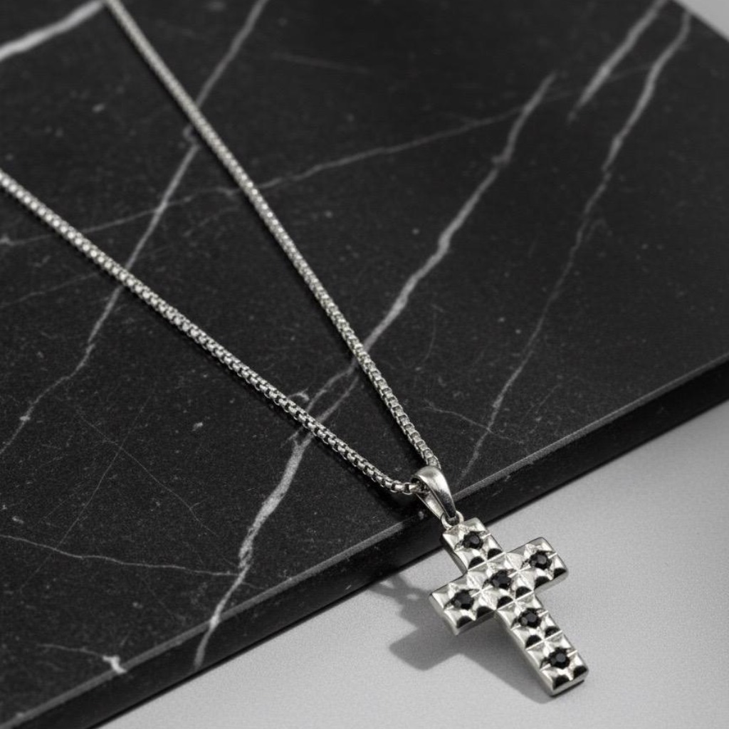Une croix texturée rehaussée de pierres noires serties, symbole intemporel de force et de protection. Une pièce chargée de sens, conçue pour accompagner chaque moment avec assurance et confiance.